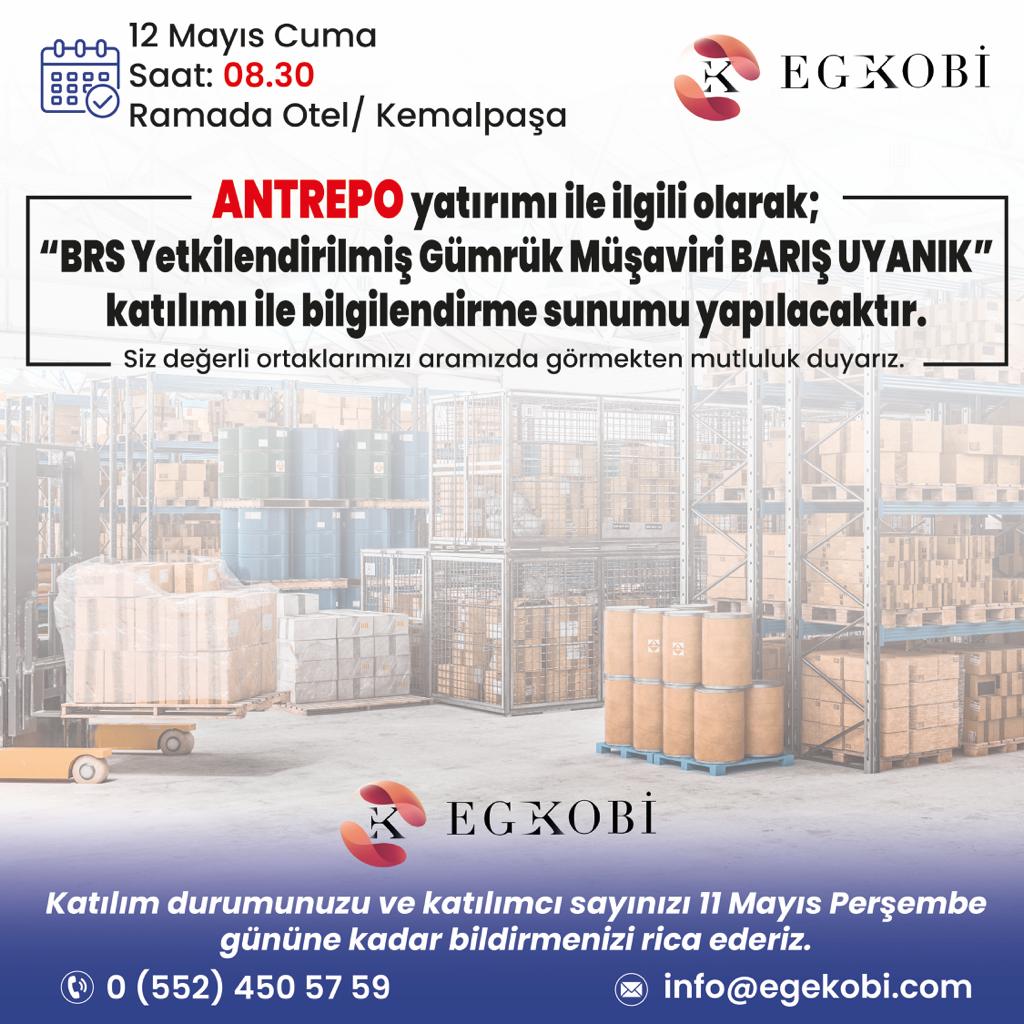 12 Mayıs 2023 Cuma günü 08:30-10:30’da Kemalpaşa Ramada Otel’de kahvaltı eşliğinde fizibilite çalışması yapılmış olan ANTREPO yatırımı ile ilgili olarak; “ BRS Yetkilendirilmiş Gümrük Müşaviri BARIŞ UYANIK” katılımı ile bilgilendirme sunumu yapılacaktır.